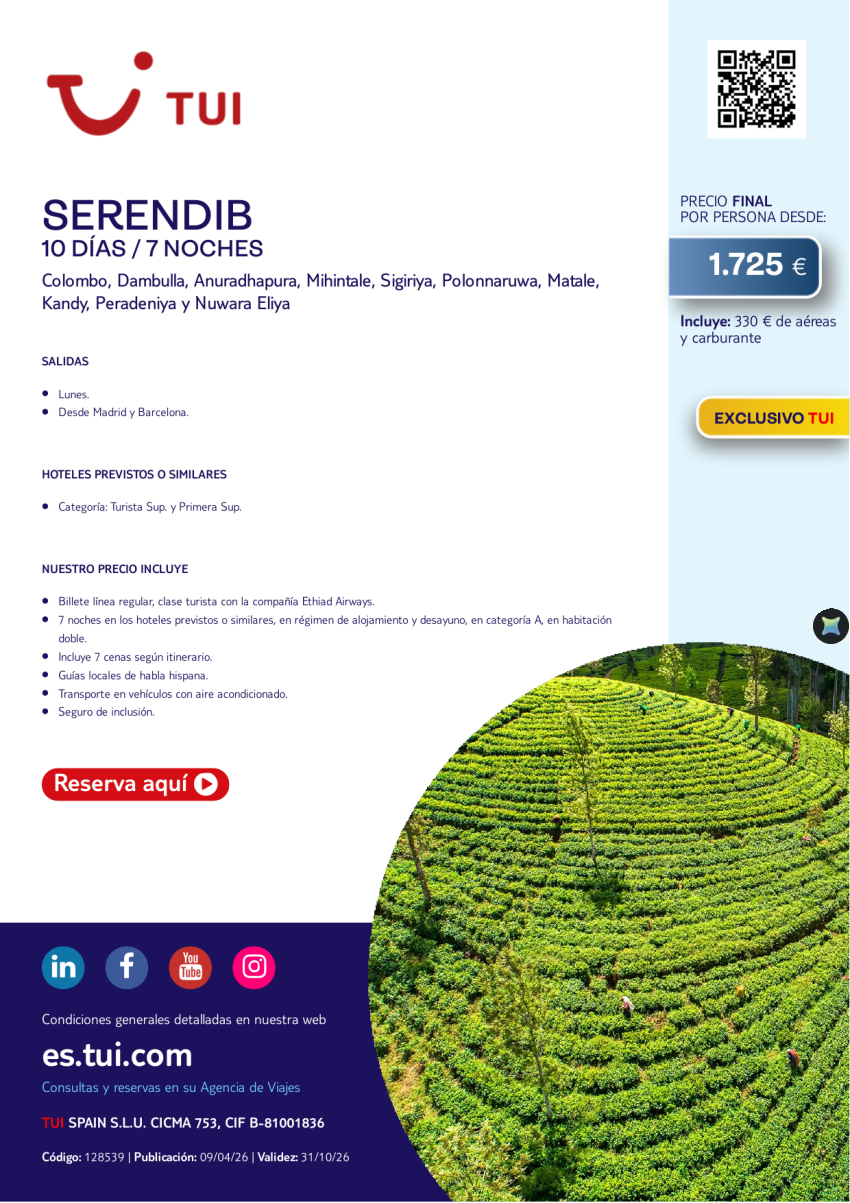 Serendib. 10 días / 7 noches. Exclusivo TUI. Salida lunes desde MAD y BCN desde 1.725 €